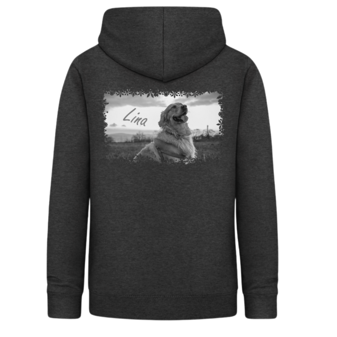 Positioniere das verhandene Design, Lade einLieblingsbild z.B. deines Hundes hoch und bearbeite das Bild im Editor. Füge einen Wunschtext ein, bearbeite und positioniere ihn